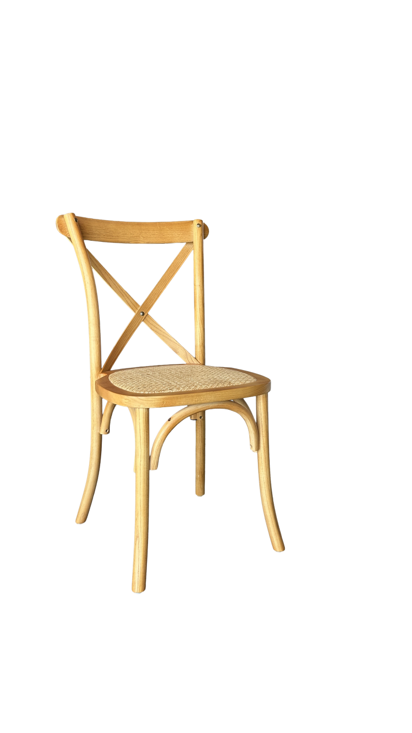 Prepoznatljivi cross back dizajn s ukrštenim naslonom ne samo da pruža vizualni dojam, već i dodatnu udobnost pri sjedenju. Ova rustikalna stolica idealna je za uređenje prostora u vintage, boho, mediteranskom ili prirodnom stilu, a posebno je omiljena kod organizatora vjenčanja i u event industriji.