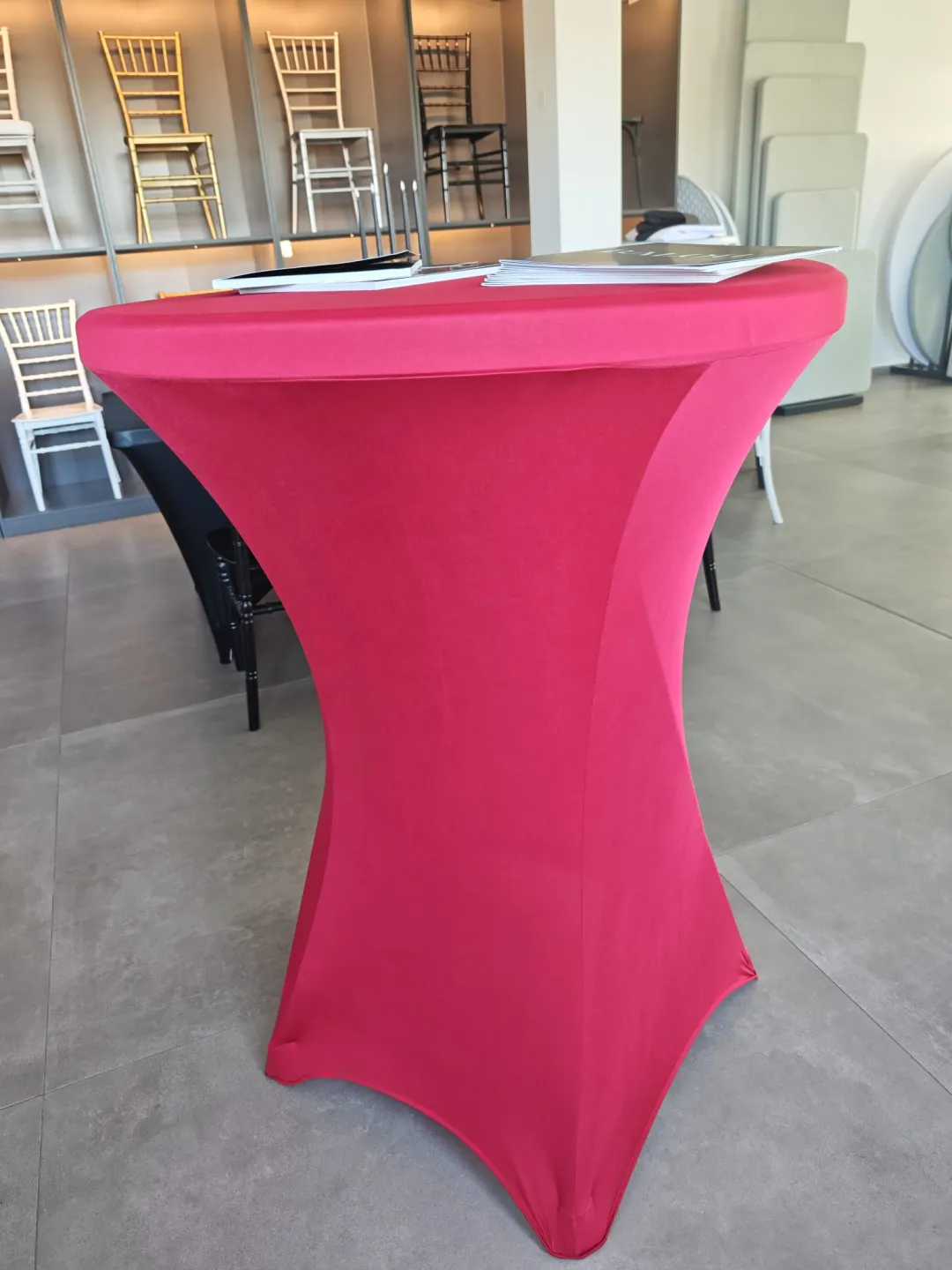 Crvena stretch presvlaka za visoki barski stol praktično je i elegantno rješenje za uređenje koktel stolova na različitim događanjima. Zahvaljujući elastičnom materijalu, presvlaka se jednostavno navlači na stol i prilagođava njegovom obliku, stvarajući uredan i moderan izgled bez nabora.